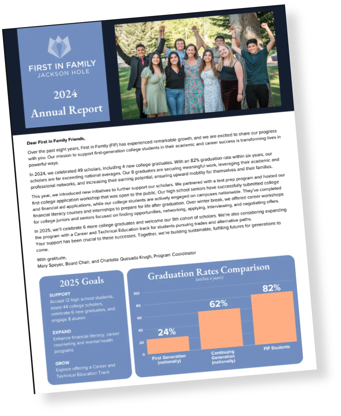 The idea for First in Family began among friends in a weekly breakfast group, several of whom now serve on the board of trustees and advisory council. The original committee included Zach Hall, Julie Giacobassi, Joe Albright, Lety Liera, Mary Speyer, and Charlie Thomson. Over the past ten years, First in Family (FIF) has experienced remarkable growth.